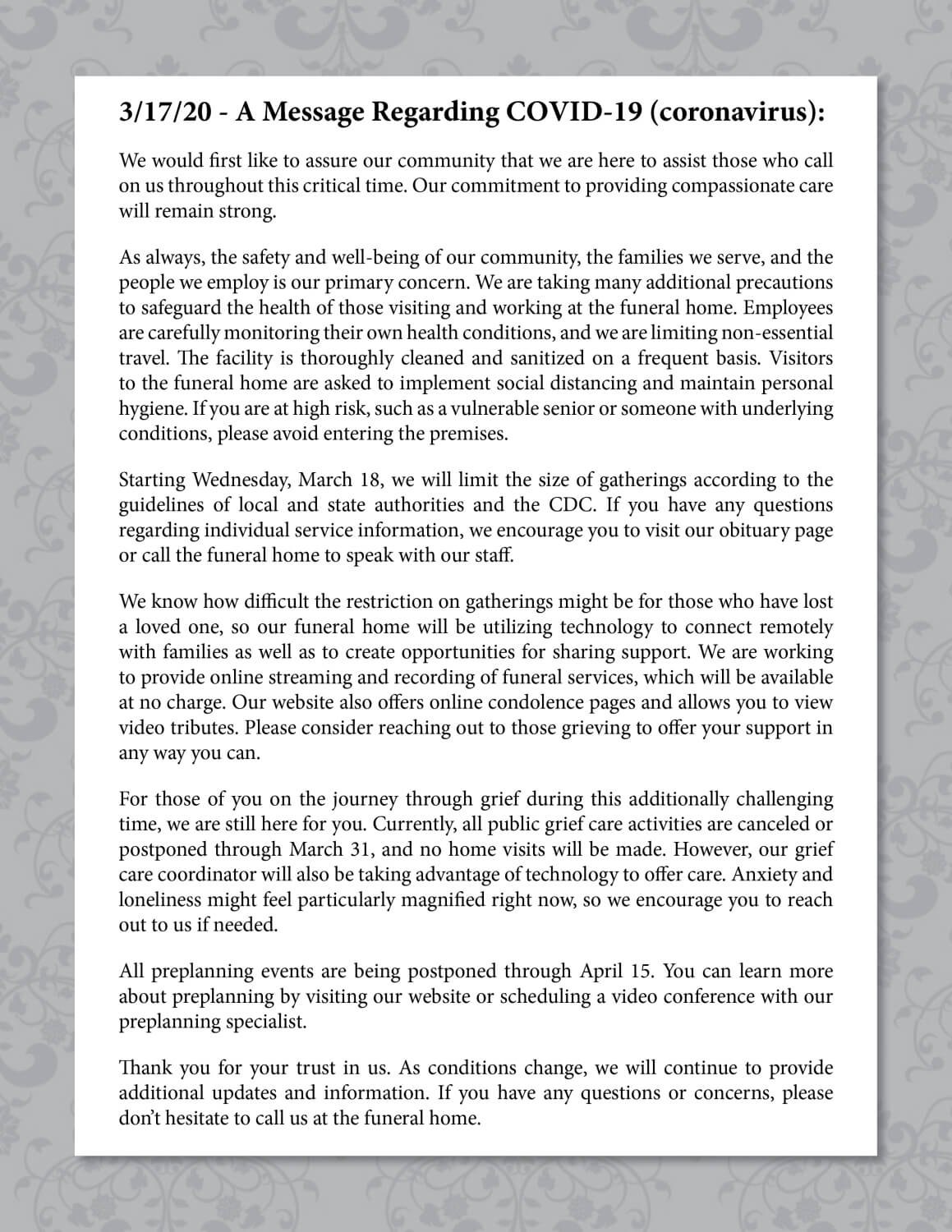 Covid 19 Update Buehler Larson Funeral Cremation Mandan Nd Funeral Home And Cremation